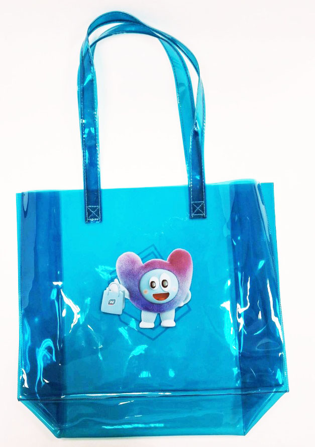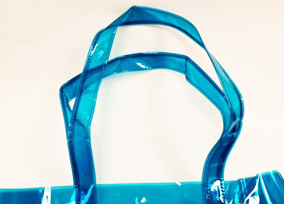 規格 : 0.3mm PVC有色透明#21, 熱壓 , 袋口無反折 , 提把雙層內折車縫 2.5*65cm