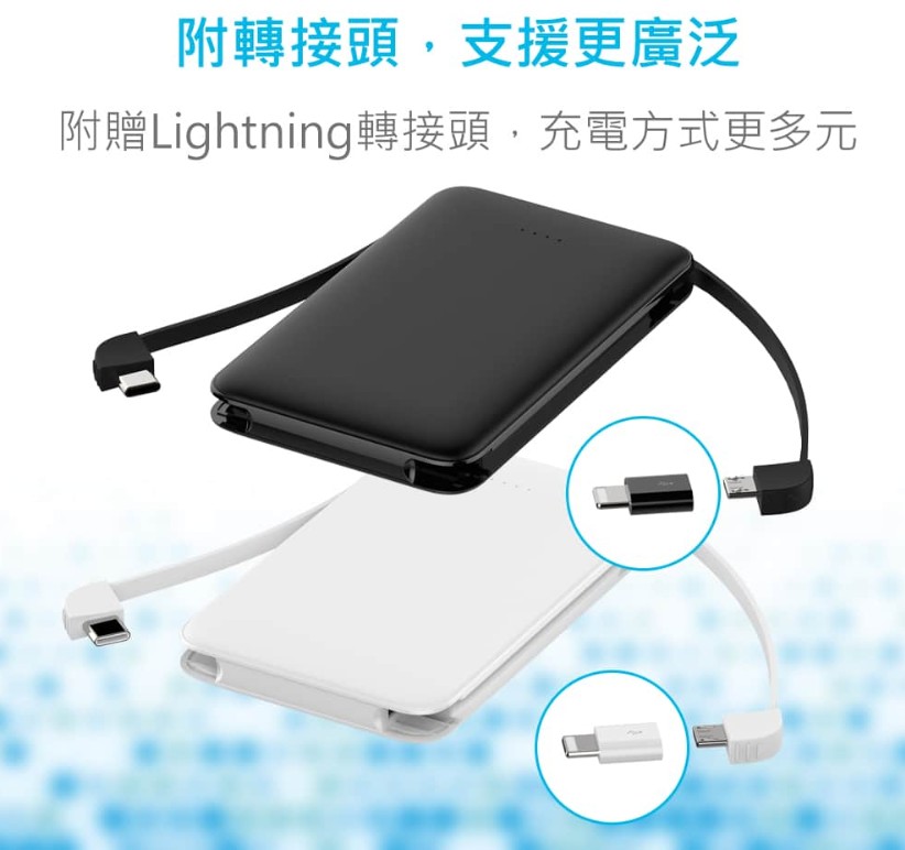 ●行動電源本身即有隱藏式充電線,提供Micro USB及Lightning雙接頭,讓您無須帶一堆線出門。