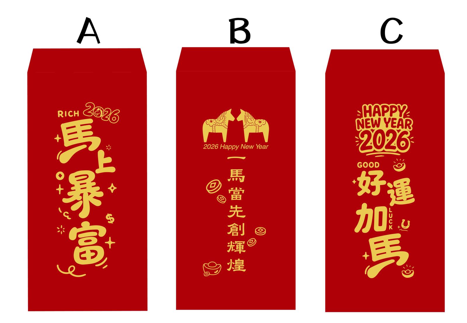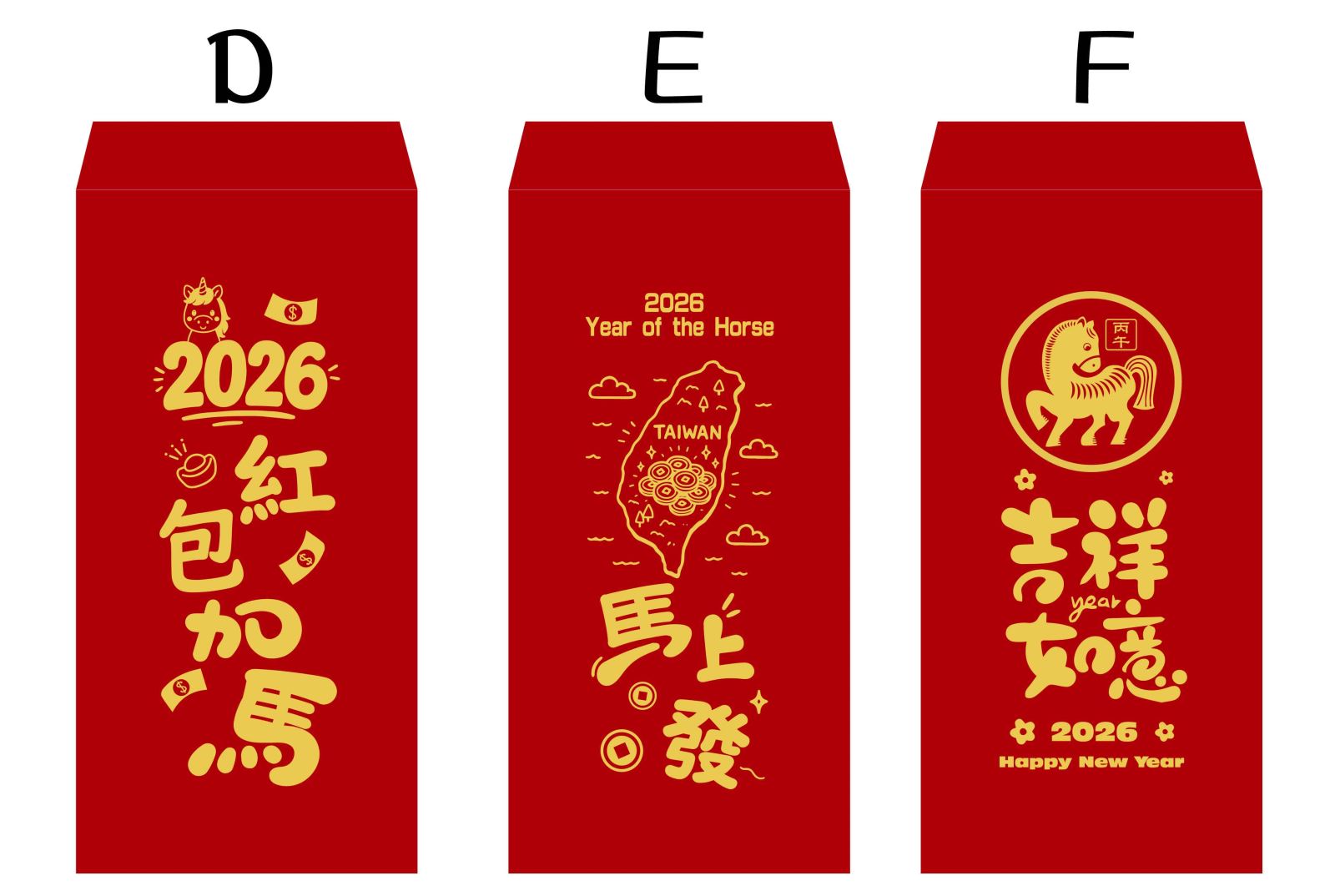 2026年馬年紅包袋設計,提供多種款式選擇,也可印上貴公司LOGO,歡迎洽詢訂製事誼!!