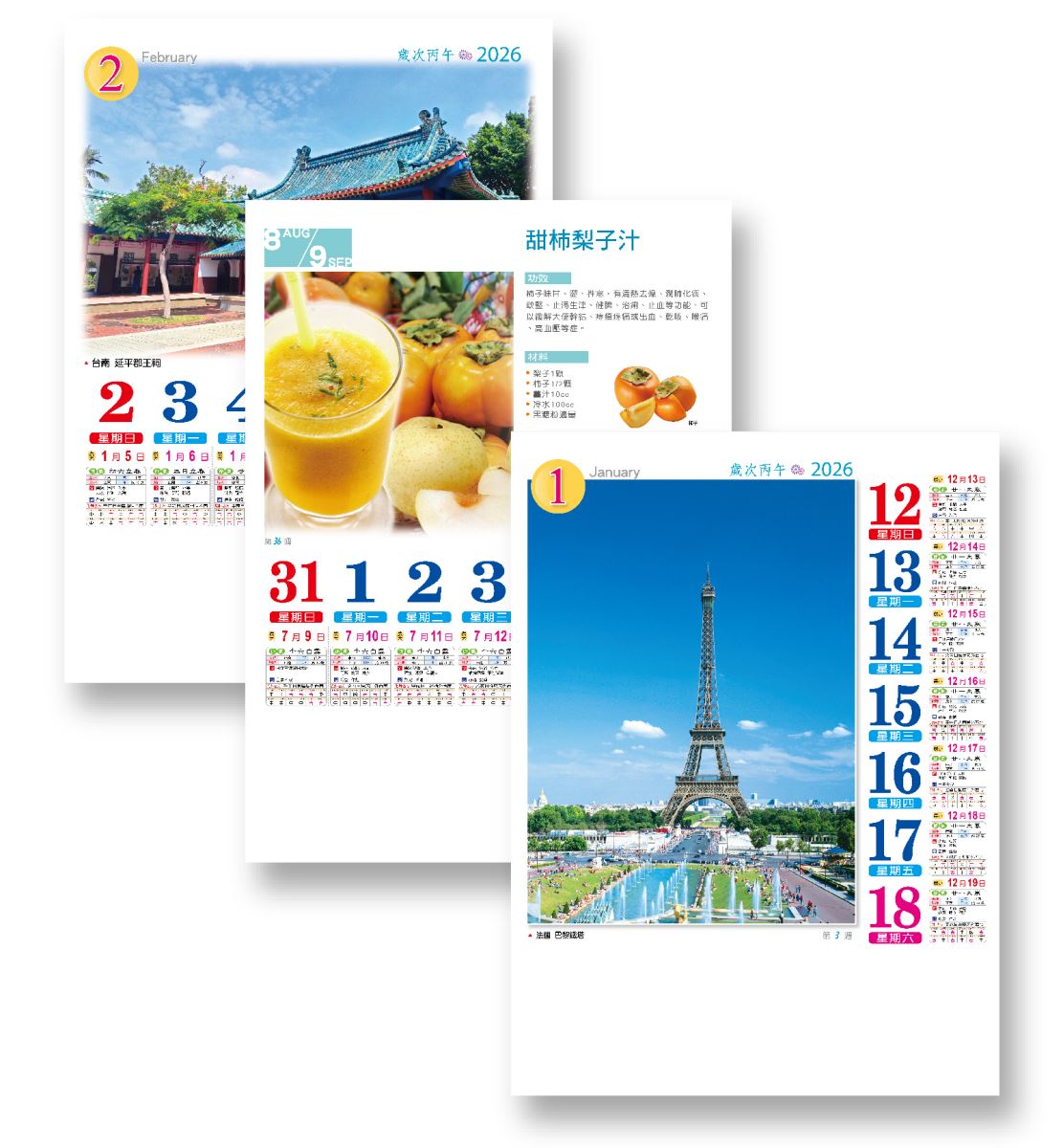 ◆本週曆相當於四本具特色的月曆,包括一本台灣風景、世界風景、大陸風景、飲品食譜,是一款送者大方,收者實惠的廣告利器。